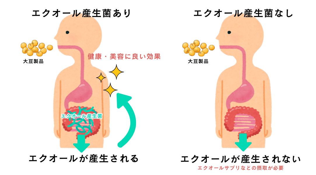 この菌を持っている人は、大豆食品などを食べることでエクオールが体内で作られ、その効果を得ることができます。
