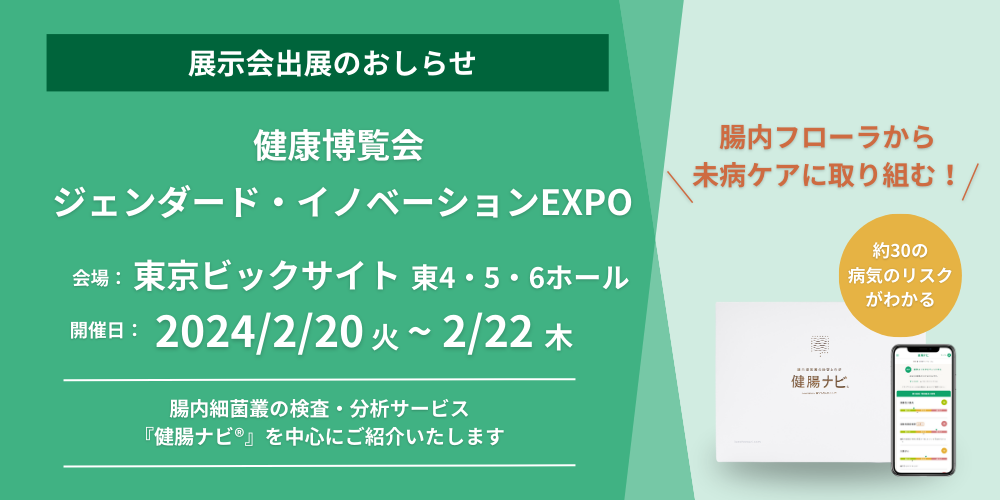 腸内細菌叢の検査・分析サービス「健腸ナビ」(個人向け)を中心に詳しくご紹介いたします。また、「SYMGRAM」(医療機関向け)も展示いたします。健康博覧会にご来場の際は、ぜひ当社ブースにお立ち寄りください。