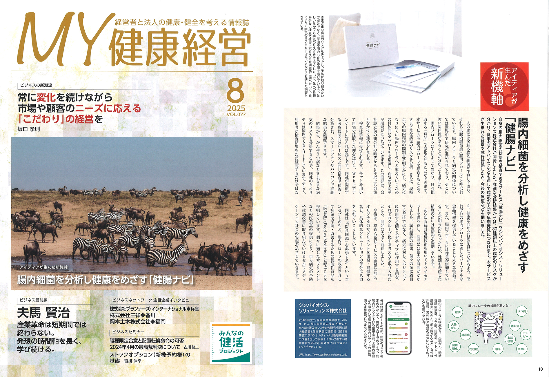 明治安田生命情報誌「MY健康経営」2025年8月号に腸内フローラ検査「健腸ナビ」が掲載されました。 「MY健康経営」は経営者と法人の健康・健全を考える情報誌で、この度、特集記事「アイディアが生んだ新機軸」にて「健腸ナビ」の特長や開発経緯を紹介していただきました。